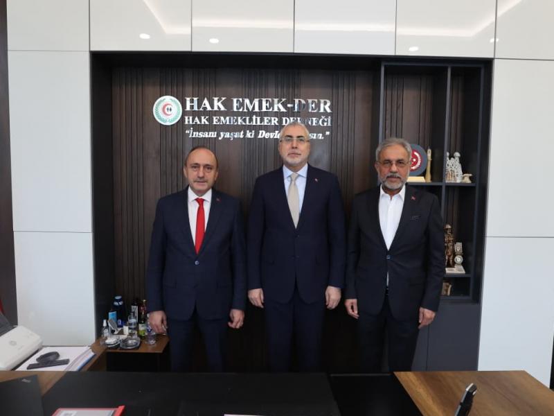 Çalışma ve Sosyal Güvenlik Bakanı Prof. Dr. Vedat Işıkhan, HAK-EMEK DER Genel Başkanımız Remzi Karataş’ı ziyaret etti. Gerçekleşen ziyarette, emeklilerin mevcut durumunu, yapısal sorunlarını ve çözüm önerilerini içeren kapsamlı rapor Bakan Işıkhan’a sunuldu.