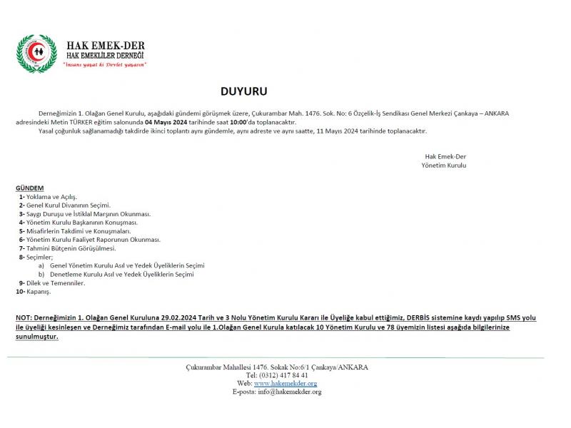 Derneğimizin 1. Olağan Genel Kurulu, aşağıdaki gündemi görüşmek üzere, Çukurambar Mah. 1476. Sok. No: 6 Özçelik-İş Sendikası Genel Merkezi Çankaya – ANKARA adresindeki Metin TÜRKER eğitim salonunda 04 Mayıs 2024 tarihinde saat 10:00’da toplanacaktır.